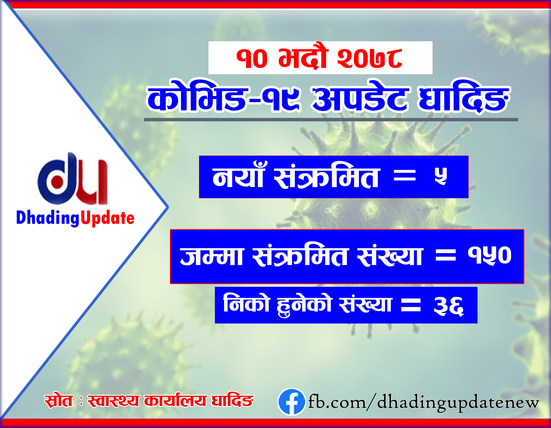 धादिङका ५ जनामा विहिबार कोरोना भाइरस संक्रमण पुष्टि भएको छ ।