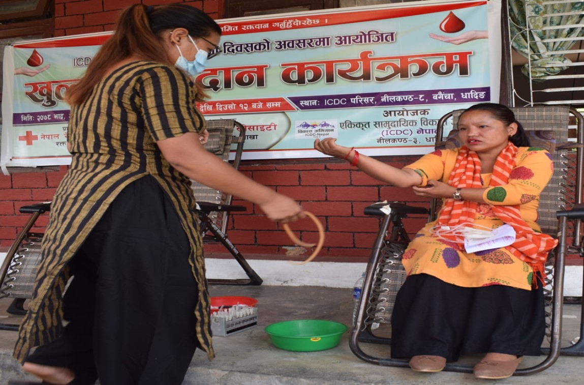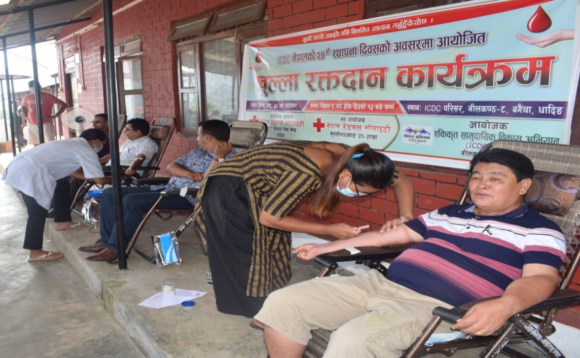 भदौ २०, धादिङ । एकिकृत सामुदायिक विकास समाज–नेपाल (आईसीडीसी) – नेपालले आफ्नो संस्था स्थापनाको २४ औं वर्षगाठको अबसरमा खुल्ला रक्तदान कार्यक्रम सम्पन्न गरेको छ । रक्तदान कार्यक्रममा १३ जना महिला र ३६ जना पुरुष गरि जम्मा ४९ जनाले रक्तदान गरेका थिए । आईसीडीसी–नेपालको आयोजनामा सम्पन्न रक्तदान कार्यक्रममा नेपाल रेडक्रस सोसाइटी मुरलीभञ्ज्याङ उप-शाखाको सह–आयोजना तथा नेपाल रेडक्रस सोसाइटी रक्तसंचार सेवा केन्द्र धादिङको प्राविधिक सहयोग रेहेको थियो ।
