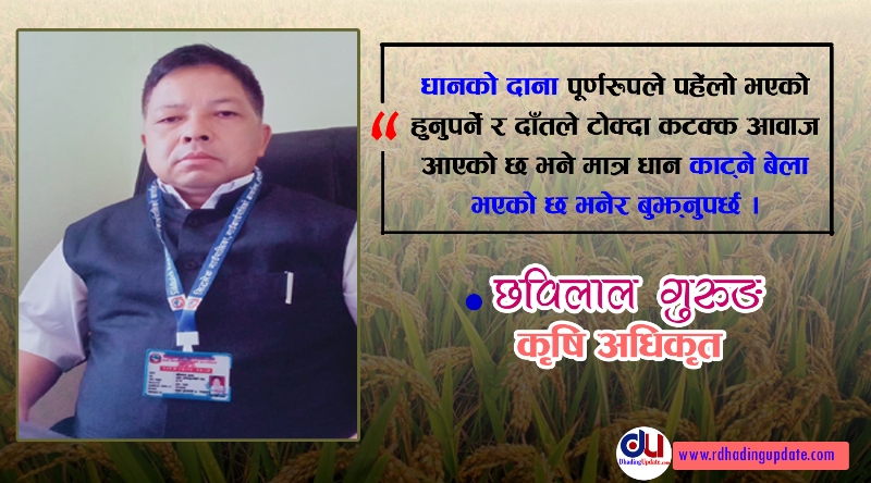 अबको केही दिन देशका विभिन्न ठाउँमा पानी पर्ने सम्भावना भएकाले धान काटेर खेतमै छोड्दा नोक्सान हुन सक्ने भएकाले सकेसम्म धान नकाट्न कृषि विज्ञले सुझाव दिएका हुन् । धान काट्दा पनि सोचेर बुझेर मात्रै काट्न विज्ञहरुले अनुरोध गरेको छ । धान पाकेको छकी छैन भनेर बुझेर मात्रै धान काट्नुपर्ने कृषि अधिकृत छविलाल गुरुङको सुझाव छ । धानको दाना पूर्ण रुपले पहेंलो भएको हुनुपर्ने र दाँतले टोक्दा कटक्क आवाज आएको छ भने मात्र धान काट्ने बेला भएको भनेर बुझ्नुपर्ने गुरुङ बताउनुहुन्छ ।