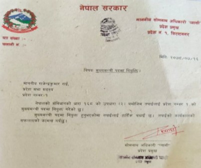 प्रदेश १ का नवनियुक्त मुख्यमन्त्री राजेन्द्र राईले आजै सपथ लिएका छन् । प्रदेशका प्रमुख सोमनाथ अधिकारी ‘प्यासी’ ले राईले पद तथा गोपनीयताको सपथ गराएका हुन् । मुख्यमन्त्रीमा नियुक्त भएसँगै प्रदेश सरकारमा थप पाँच मन्त्री नियुक्त गरिएको छ ।