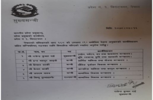 सत्तारुढ गठबन्धन दलहरुको सहमतिअनुसार नेपाली कांग्रेसले २, नेकपा (माओवादी केन्द्र) ले १, जनता समाजवादीले १ मन्त्री पाएका छन् । संयुक्त लोकतान्त्रिक राष्ट्रिय मञ्चलाई पनि एक राज्यमन्त्री दिइएको छ ।