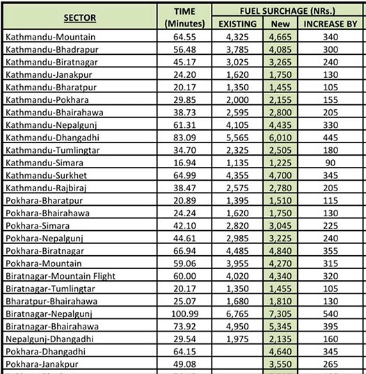 अहिले नेपाल आयल निगमले हवाइ इन्धन प्रतिलिटर १३६ रुपैयामा विक्रि गरेको छ । निगमले आन्तरिक हवाइ इन्धन ११३ रुपैयामा खरीद गरी २३ रुपैया ८ पैसा नाफा राखेर १३६ रुपैया प्रति लिटरमा विक्री गरेको छ । एयरलाइन्स अपरेटर्स एसोसियसन अफ नेपालले आन्तरिक उडानमा ९० रुपैयादेखि ५४० रुपैयासम्म बृद्धि गरेको छ । सबैभन्दा कम काठमाडौं – सिमरा उडानमा बढेको छ, भने बढी विराटनगर–नेपालगञ्ज रुटमा बढेको छ ।