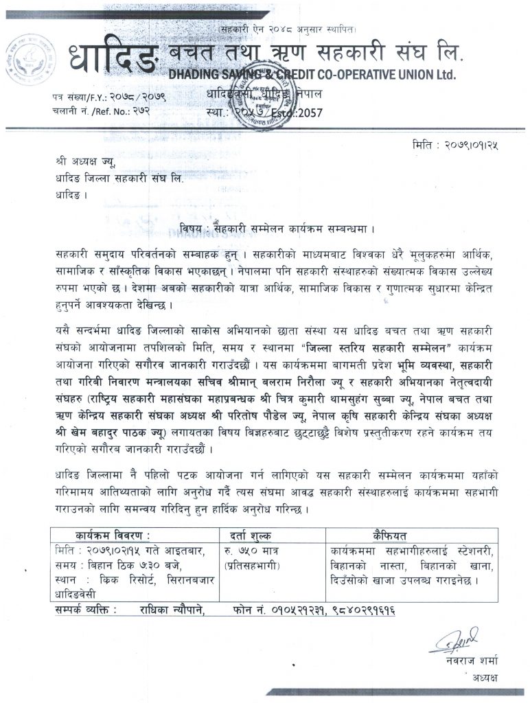 धादिङ – बचत तथा ऋण सहकारी संस्थाहरुको छाता संस्था, धादिङ बचत तथा ऋण सहकारी संघले यहि जेठ १५ गते सदरमुकाम धादिङबेसीमा पहिलो जिल्ला स्तरिय सहकारी सम्मेलन गर्ने भएको छ । देश विकासको लागि सहकारीको यात्रा आर्थिक, सामाजिक विकास र गुणात्मक सुधारमा केन्द्रित हुनुपर्ने भन्दै सम्मेलन गर्न लागेको हो ।