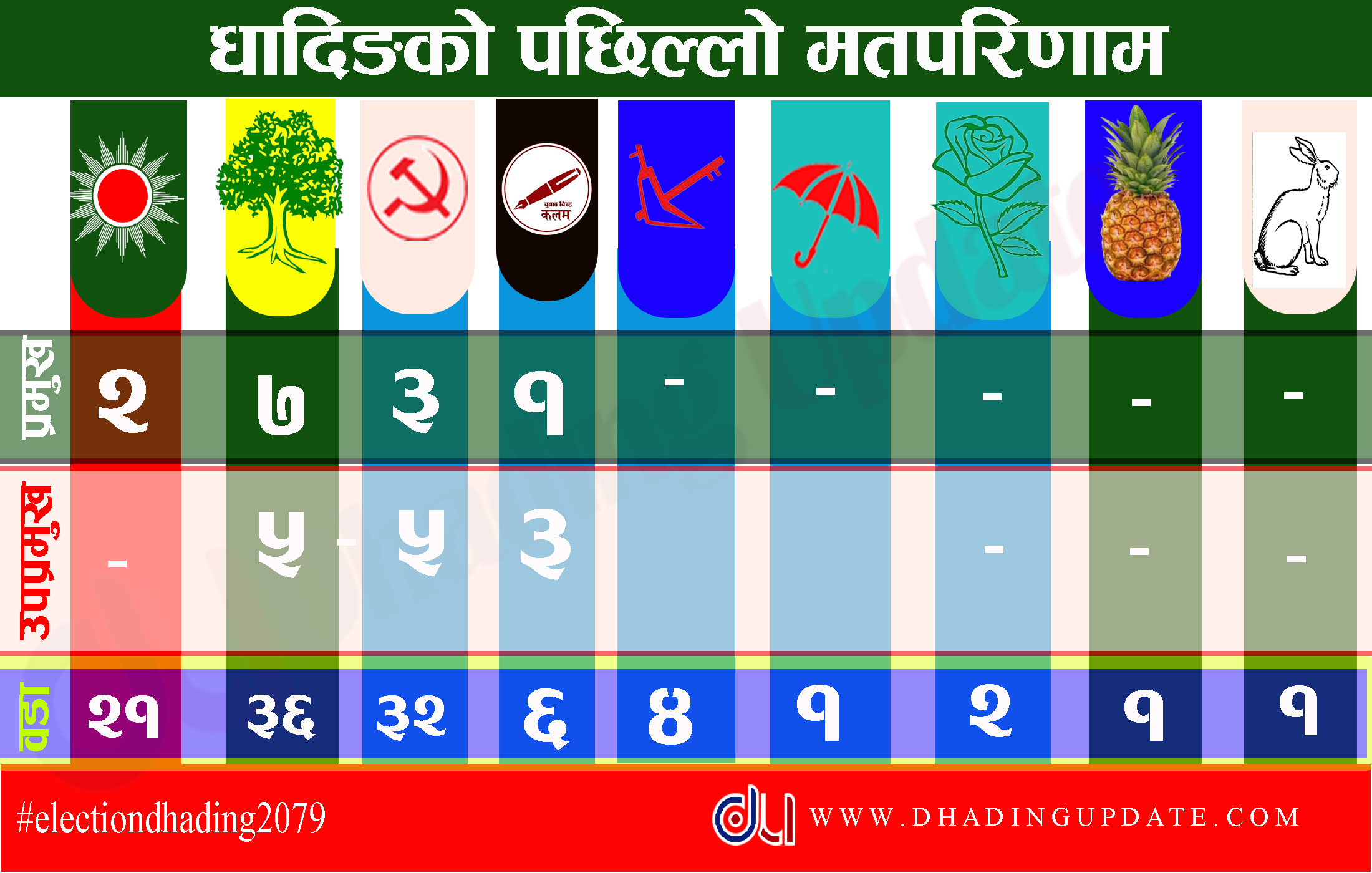 धादिङमा बैशाख ३० गते सम्पन्न स्थानीय तहको निर्वाचनको मतगणना सकिएको छ । अन्तिम मतपरिणाम सँगै धादिङमा ७ पालिका प्रमुख, ५ उप प्रमुख र ३६ वडा जित्दै नेपाली कांग्रेस पहिलो पार्टी बनेको छ । यस्तै ३ पालिका प्रमुख, ५ उप प्रमुख र ३२ वडा जित्दै माओवादी केन्द्र दोस्रो बनेको छ । नेकपा एमालेले २ प्रमुख सहित २१ वटा वडा जित्यो भने एकीकृत समाजवादीले १ प्रमुख सहित ६ वटा वडा जितेको छ ।