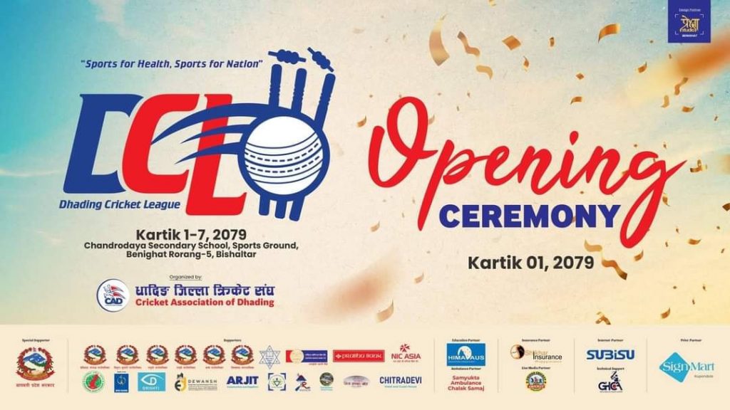 कात्तिक एक गतेदेखि सात गतेसम्म हुन लागको धादिङ जिल्ला क्रिकेट लिगको खेल तालिका हिजो नै सार्वजनिक गरेको थियो । प्रतियोगितामा जिल्लाभरका आठ ओटा पालिकाका सहभागी हुँदैछन् । खेल तालिका अनुसार चार/चार टिम राखेर दुई समुहमा खेल हुनेछ । चाडपर्वको समयमा विभिन्न क्लवहरुले स्थानीय स्तरमा फाट्ट फुट्ट क्रिकेट प्रतियोगीता गर्दै आएकोमा पछिल्ला दिनहरुमा गाउँपालिका स्तरीय क्रिकेट प्रतियोगीता समेत हुन थालेको छ ।