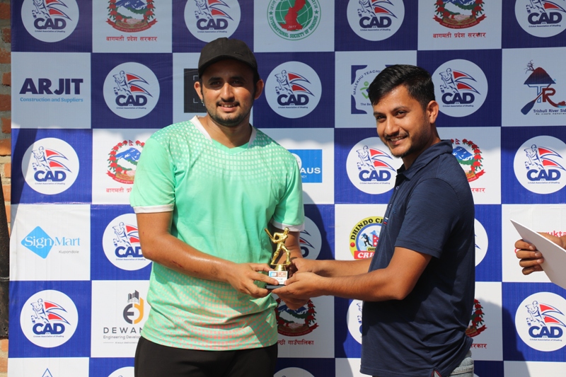 आक्रामक ब्याटिङ गर्नुभएका कप्तान पाठकले एक चौका र चार छक्का प्रहार गर्नुभएको थियो । सुनिल बानियाले २१ तथा प्रनित भट्टले १७ रन जोड्नुभएको थियो । निकै रोमाञ्चक भएको खेलमा त्रिपुरासुन्दरी गाउँपालिकाका राम रानाले ४ ओभरमा २५ रन खर्चिएर ३ विकेट लिनुभयो । यस्तै श्री कृष्ण उपाध्यायले ४ ओभरमा १ मेडन राख्दै १५ रन खर्चिएर ३ विकेट लिनुभयो भने उदय थापाले २ विकेट लिनुभयो । खेलको म्यान अफ द म्याच अल राउण्डर प्रदर्शन गर्नुभएका कौशल रुपाखेती घोषित हुनुभयो ।
