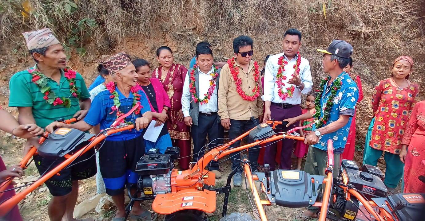 ९ वटा मिनिटिल, १० वटा हिल्ट्याङ, पानी तन्न्ने मोटर ,पाइप लगाएत ७ लाख ५० हजार रकम बराबरको कृषि सामाग्री गाउँपालिकाका अध्यक्ष विवेक थपलियाले वितरण गर्नुभएको हो ।
