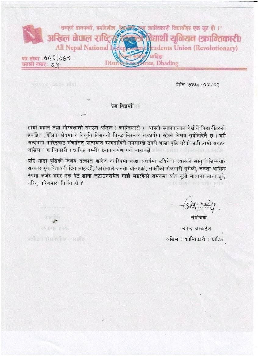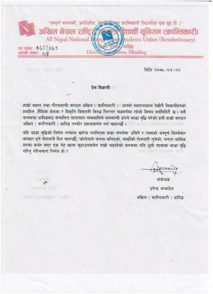 सरकारले साउन १ गतेदेखि लागु हुने गरि भाडादर समायोजन गरेको भएपनि कोरोनाको समयमा, कतिले रोजगारी गुमाएको, आर्थिक अवस्था कमजोर भएको समयमा २८ प्रतिशत भाडा वृद्धि गर्नु गरिब जनता मार्ने निर्णय भएकोले यो निर्णय तत्काल फिर्ता गर्न सरकारको ध्यानाकर्षण गराउन विज्ञप्ति निकालेको अखिल क्रान्तिकारी धादिङका जिल्ला संयोजक उपेन्द्र जमकट्टेलले बताउनुभयो ।