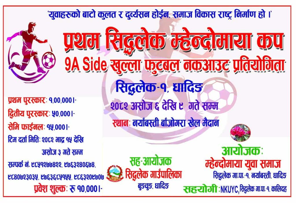 धादिङको सिद्धलेक गाउँपालिका वडा नम्बर १ मा असोज ६ गतेदेखि प्रथम सिद्धलेक म्हेन्दोमाया कप 9 A Side खुल्ला फुटबल नकआउट