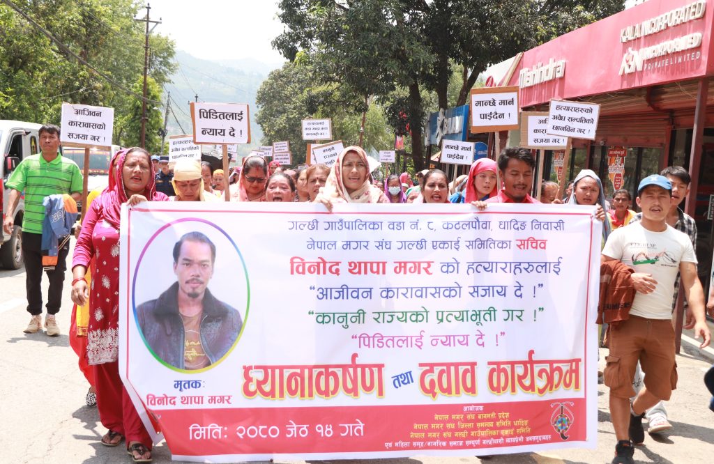 १४ जेठ,धादिङ । धादिङको गल्छि गाउँपालिका–८ का विनोद थापा मगरको हत्यामा संलग्न तीनै जनालाई आजिवन जेल सजायको माग राख्दै आफन्त