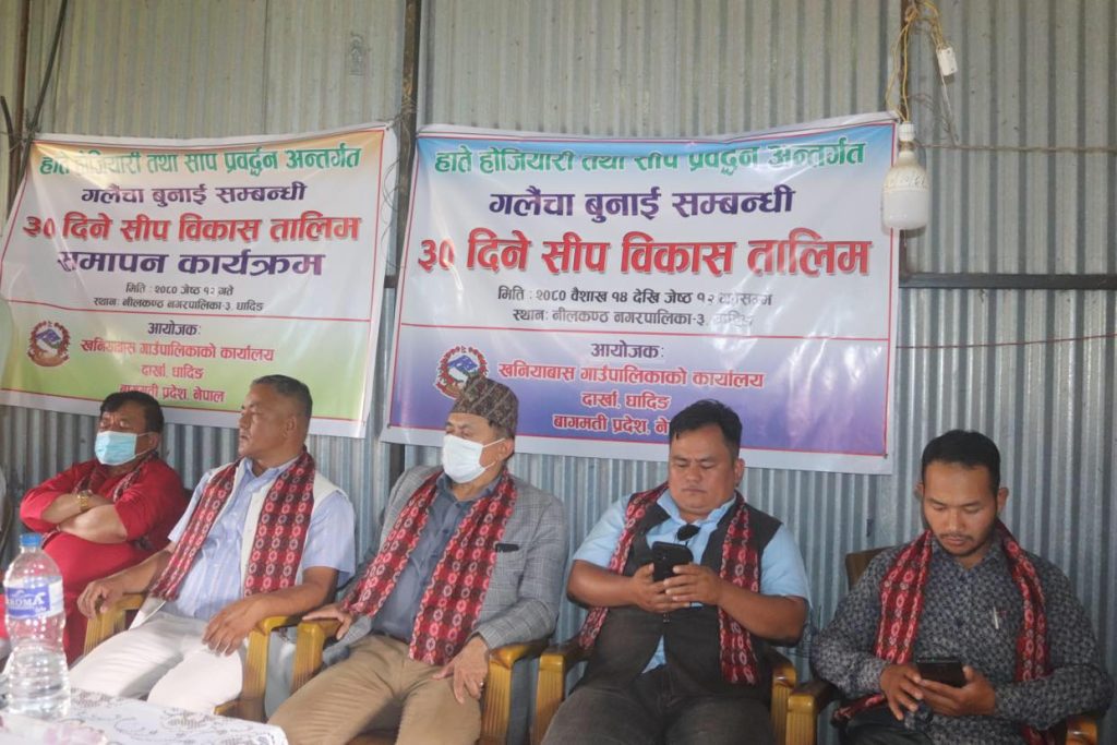 गलैचा बुनाइ सम्बन्धि ३० दिने सीप विकास तालिम शुक्रबार सम्पन्न भएको छ । बेरोजगार न्यूनिकरण गर्ने उद्देश्यले खनियाँबास गाउँपालिकाको आयोजनामा