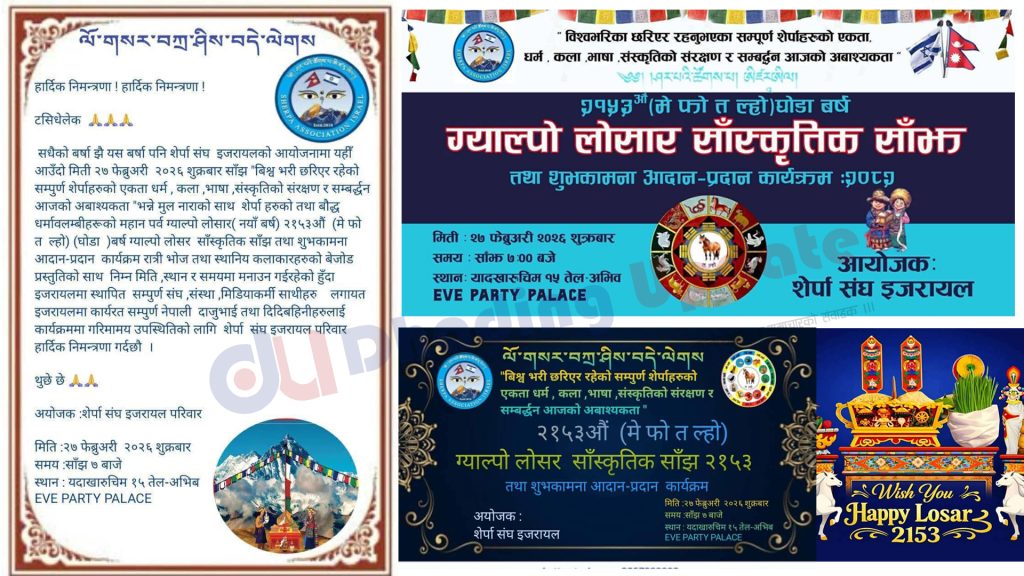 ८ फागुन इजरायल – २७ फेबु्रअरी, २०२६ शुक्रबारका दिन साँझ शेर्पा संघ इजरायलले ग्याल्पो ल्होसार विशेष कार्यक्रम गर्ने भएको छ
