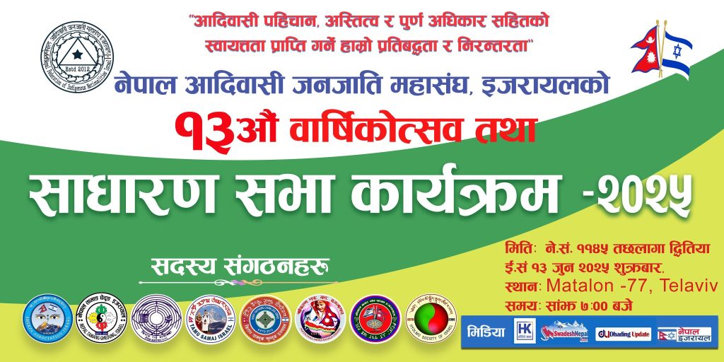 २७ बैशाख इजरायल – नेपाल आदिवासी जनजाति महासंघ (नेफिन) इजरायलले आगामी १३ जुनमा संस्थाको १३ औं वार्षिकोत्सव तथा साधारण सभा