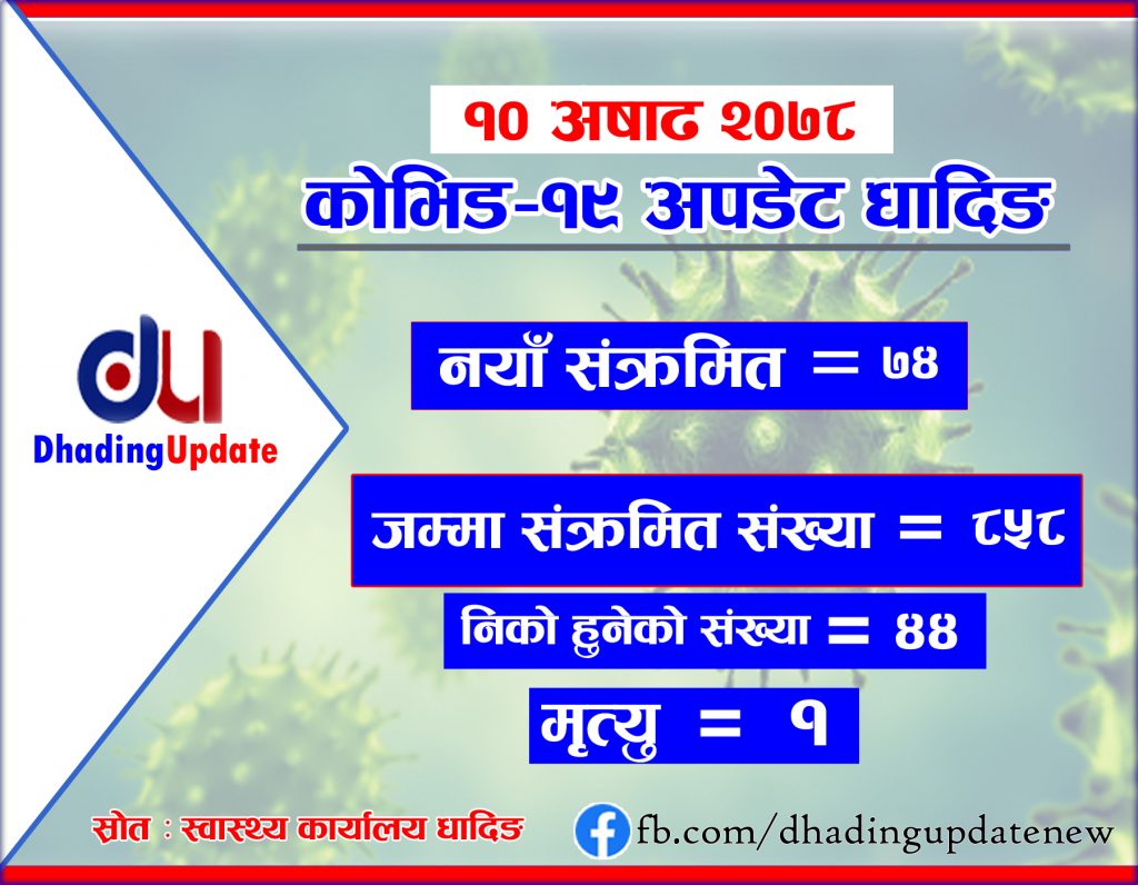 धादिङका ७४ जनामा विहिबार कोरोना भाइरस संक्रमण पुष्टि भएको छ । संक्रमण पुष्टि हुनेमा निलकण्ठ नगरपालिकाका ३२ जना, गल्छी, गजुरी