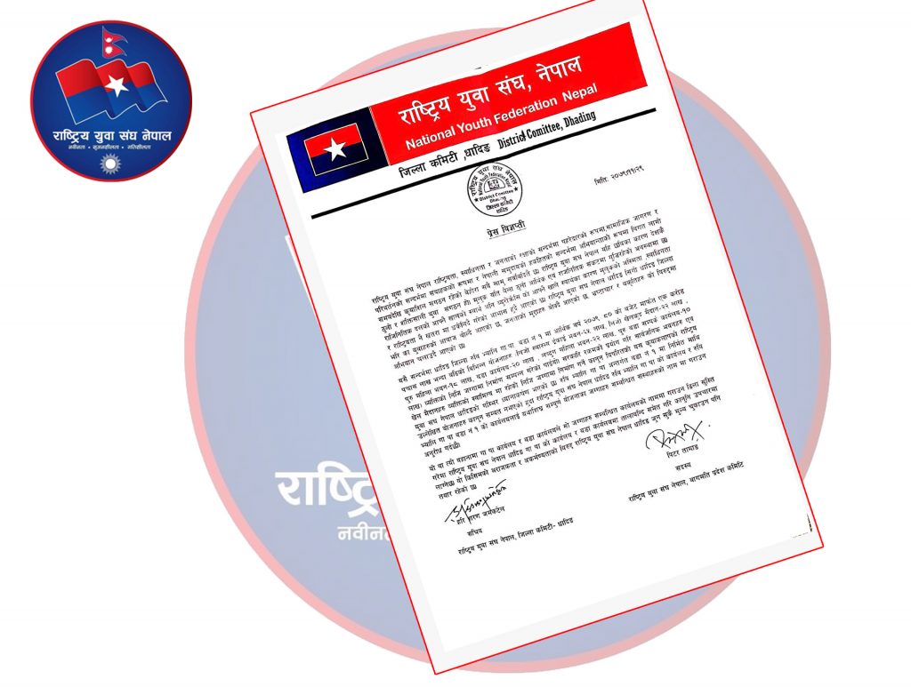 राष्ट्रिय युवासंघ नेपाल धादिङले सोमबार एक प्रेस वित्रप्ती प्रकाशन गर्दै रुबीभ्याली गाउँपालिका वडा नम्बर १ मा भएको अनियमितताको भण्डाफोर गरेको