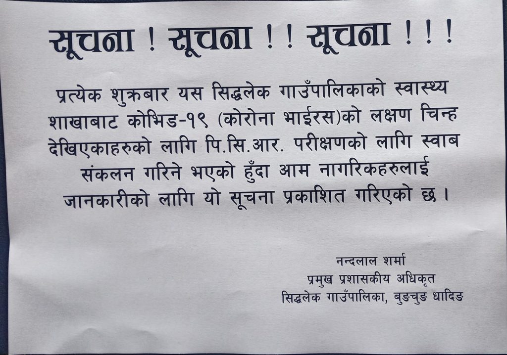 धादिङको सिद्धलेक गाउँपालिकाले प्रत्येक शुक्रबार स्वाव संकलन गर्ने भएको छ । कोभिड १९ को लक्षण चिन्ह देखिएकाहरुको पिसिआर परिक्षणको लागि