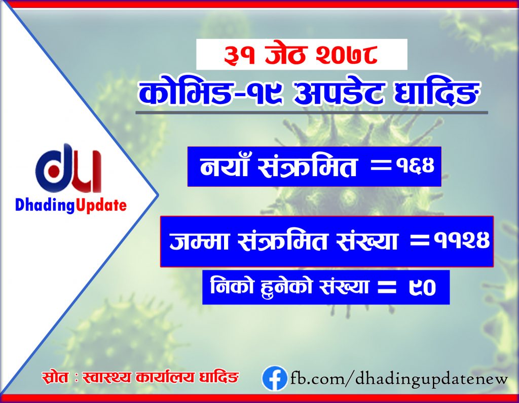 धादिङमा ४६ जनामा विहिबार कोरोना भाइरस संक्रमण पुष्टि भएको छ । संक्रमण पुष्टि हुनेमा निलकण्ठ नगरपालिकाका २७ जना, गल्छी गाउपालिकाका
