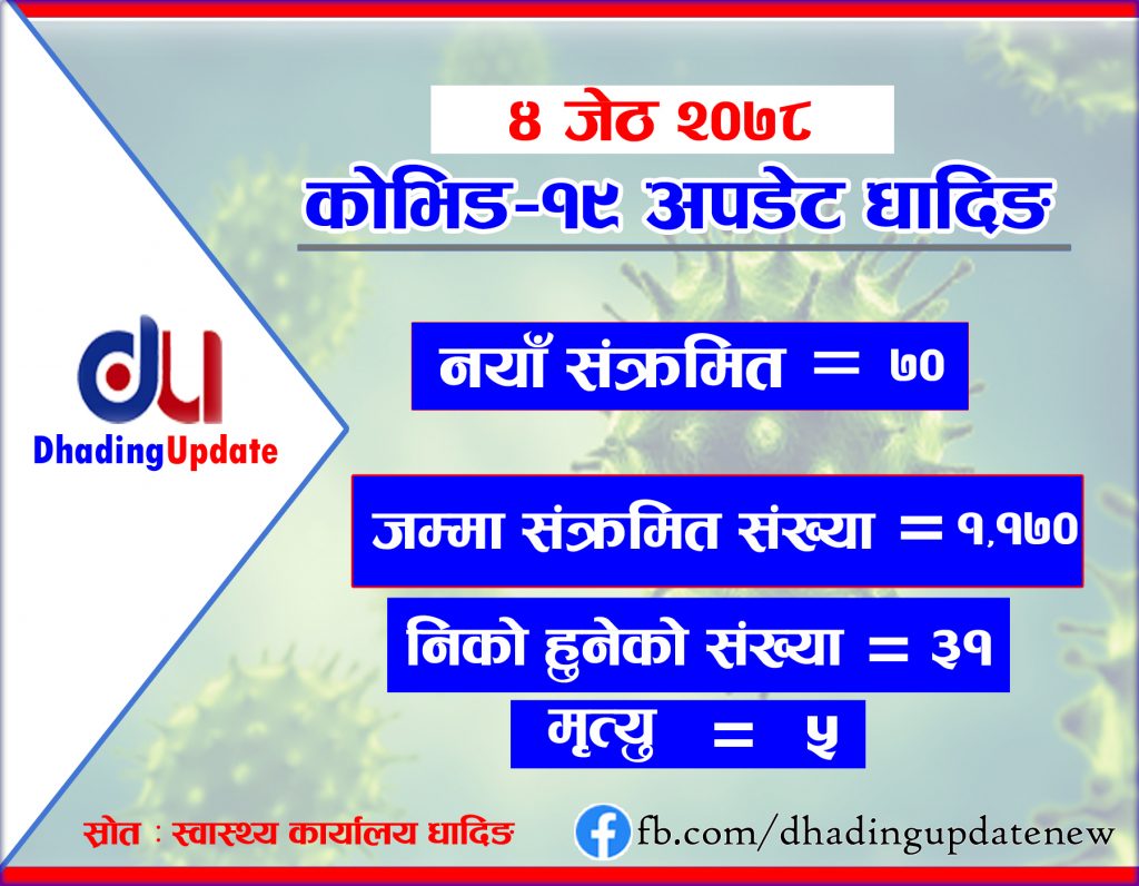 धादिङका ४ जनाले कोरोना भाइरस संक्रमणका कारण ज्यान गुमाएका छन् । जसमा धुनिबेसि नगरपालिकाका ९२ बर्षीय पुरुष, ४० बर्षीया महिला,