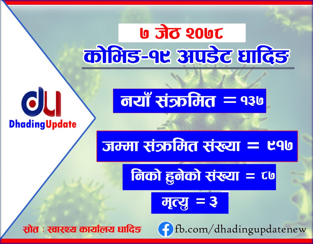 धादिङ मंगलबार थप ३ जना कोरोना संक्रमितको मृत्यु भएको । मृत्यु हुनेमा निलकण्ठका ७२ वर्षिय पुरुष, सिद्धलेक गाउँपलिकाका ३५ वर्षिय